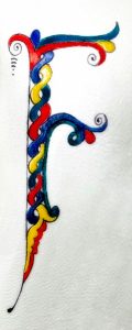 Nos hemos puesto manos a la obra con un nuevo proyecto relacionado con la Biblia de Danila. La primera toma de contacto ha sido reproduciendo dos bellísimas iniciales: una A del folio 80v y una F del folio 214v. No hemos localizado ningún estudio que determine qué pigmentos fueron utilizados por el maestro encargado de la decoración del libro, así que teniendo en cuenta pigmentos que pudieran estar disponibles en esa época hemos recurrido a cinabrio, oropimente, azurita y verdigris. Como soporte hemos utilizado pergamino de piel de cabrito.