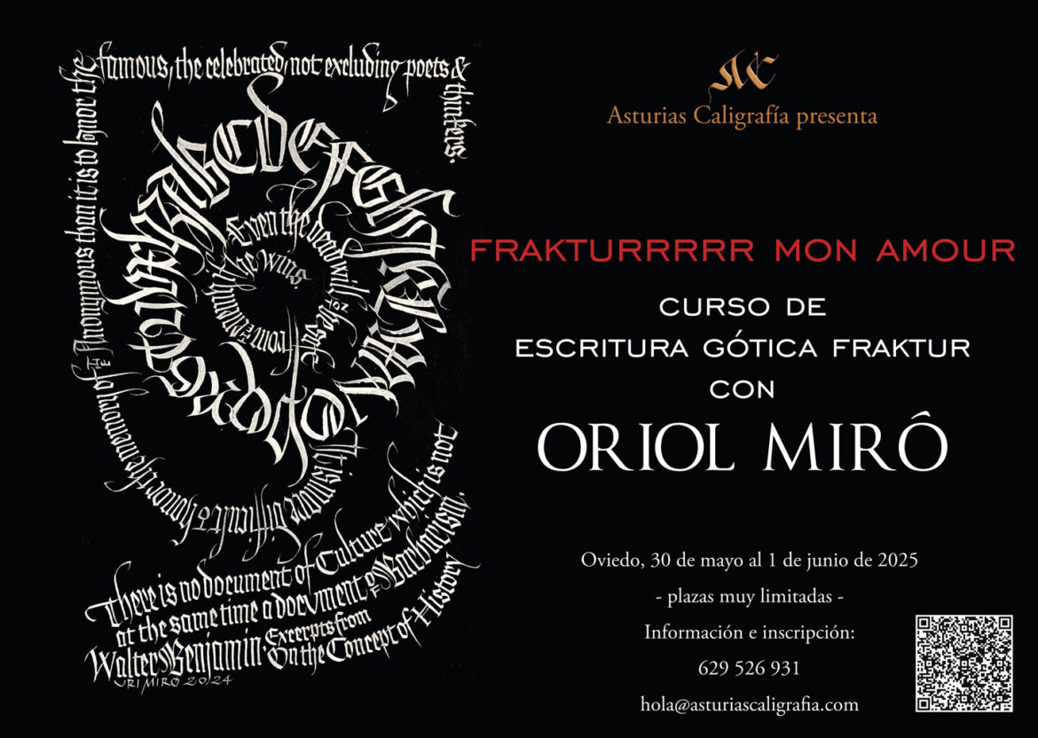 Te apasiona la caligrafía y quieres aprender uno de los estilos más icónicos y expresivos de la escritura gótica? Tenemos el placer de anunciar el curso intensivo «Frakturrrrr mon amour», impartido por el reconocido maestro calígrafo Oriol Miró, que se celebrará en Oviedo del 30 de mayo al 1 de junio de 2025.